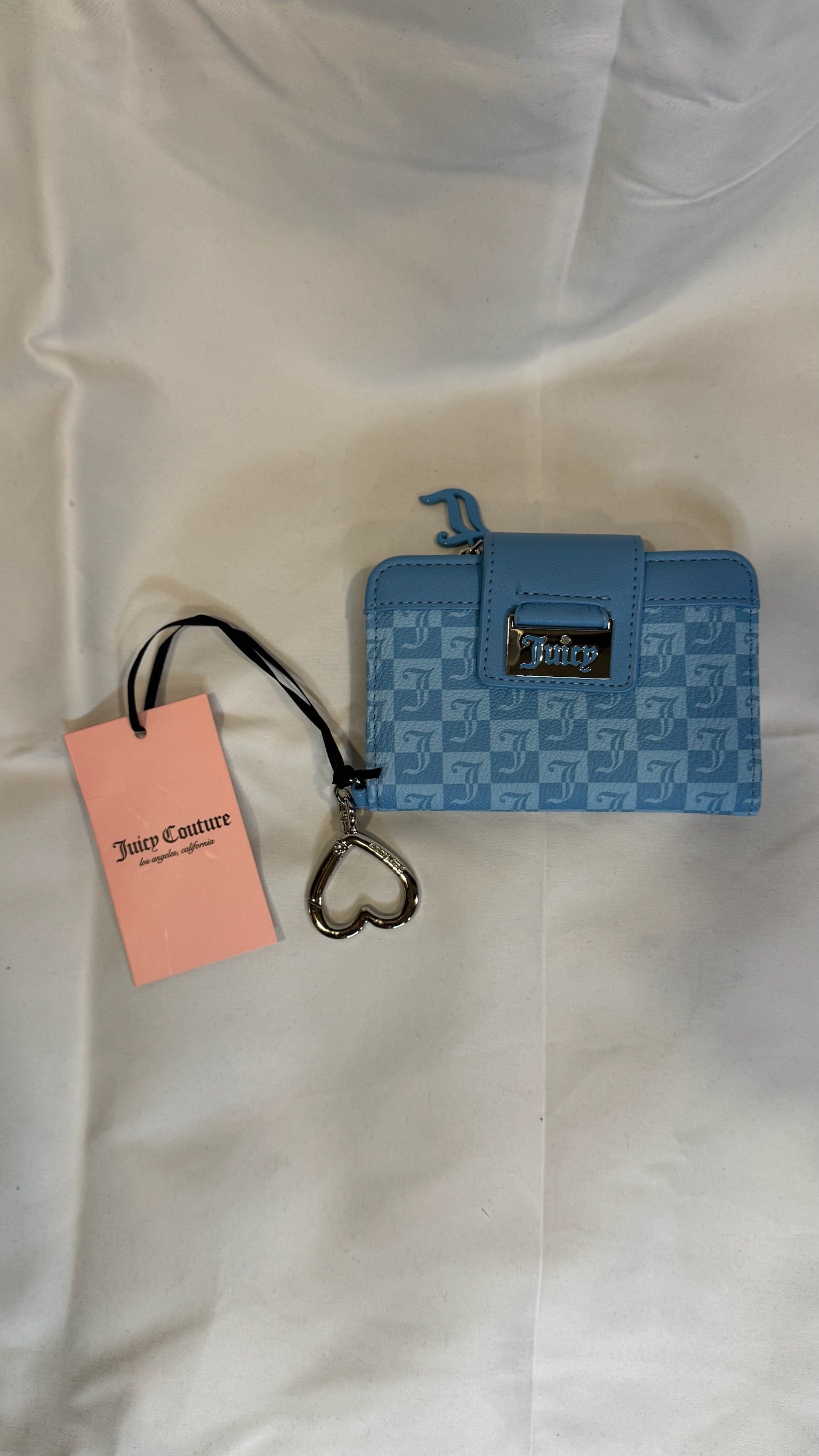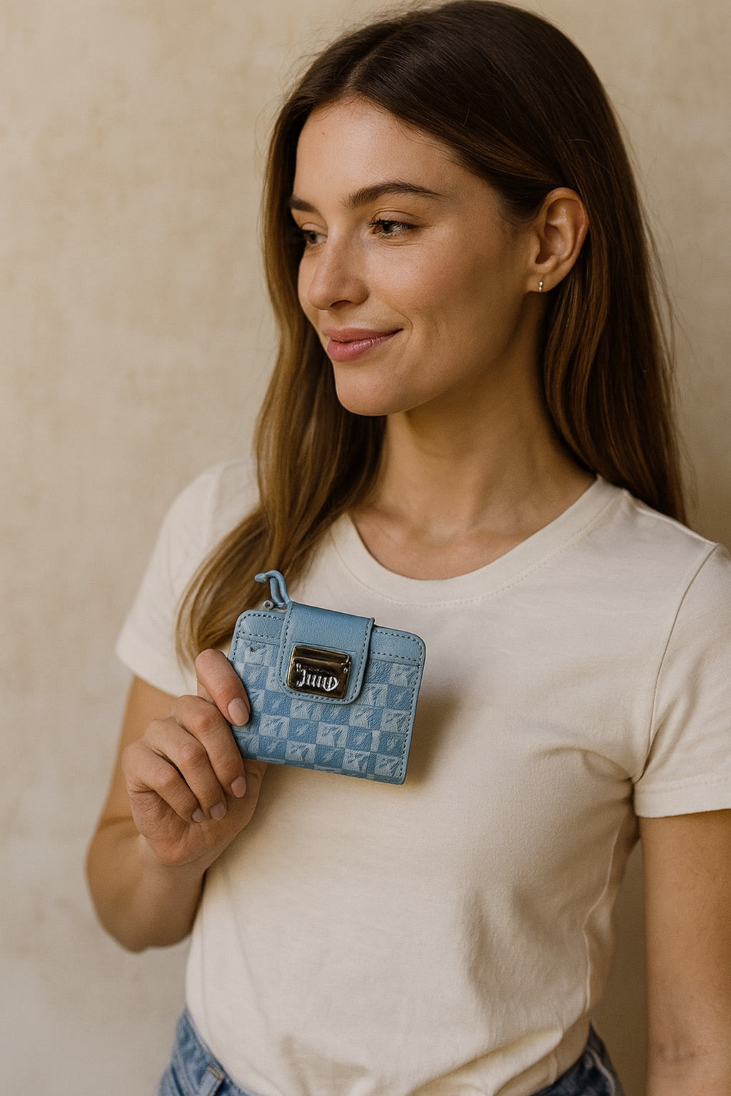 Cartera compacta Juicy Couture en tono azul con estampado monogram clásico. Incluye cierre seguro y compartimentos prácticos para billetes, tarjetas y monedas. Su diseño moderno y juvenil la convierte en el accesorio ideal para el día a día con un toque fashion.