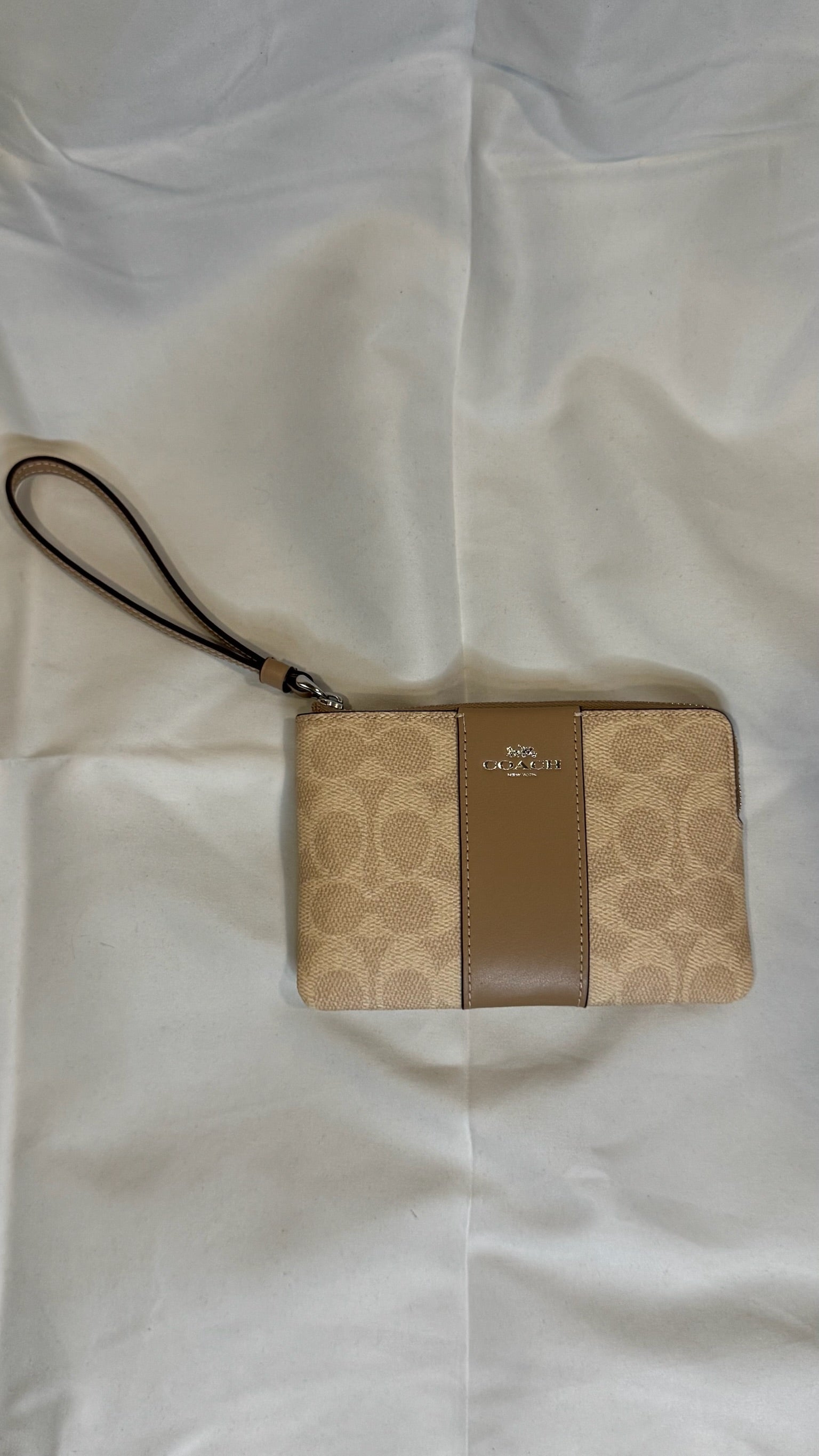 Clásico wristlet Coach en tono beige con detalles en piel café y el icónico monograma de la marca. Diseño compacto y práctico con correa de muñeca desmontable, ideal para llevar lo esencial con estilo. Perfecto para usar solo o dentro de tu bolsa favorita.